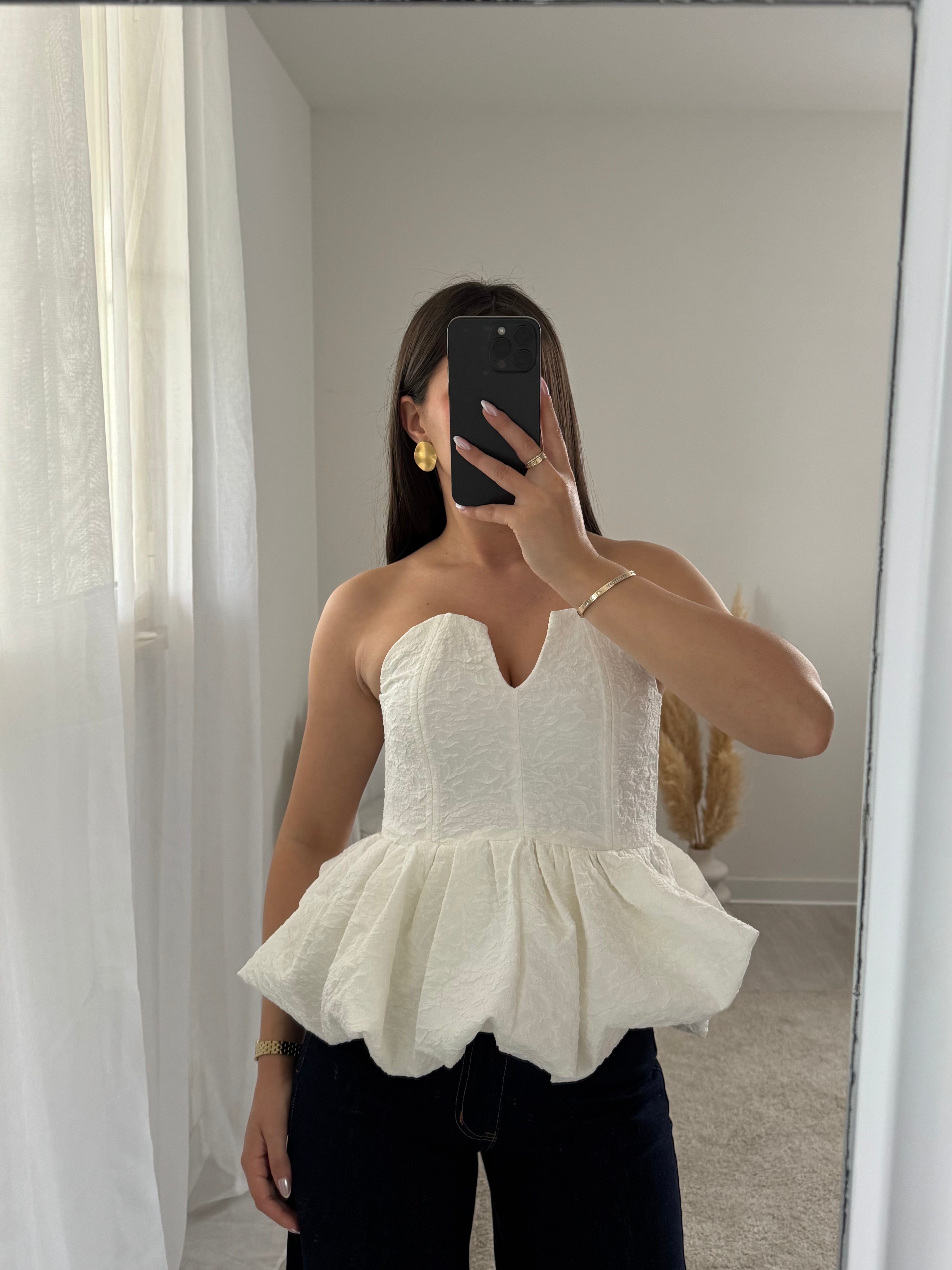 Top lunghezza regolare con stecche e fodera interna, leggermente elasticizzato con chiusura zip sul retro.