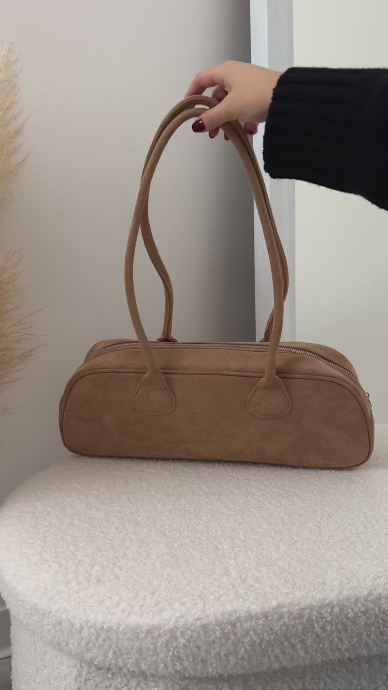 Borsa in suede con chiusura con zip e 3 tasche interne di cui una con la zip.