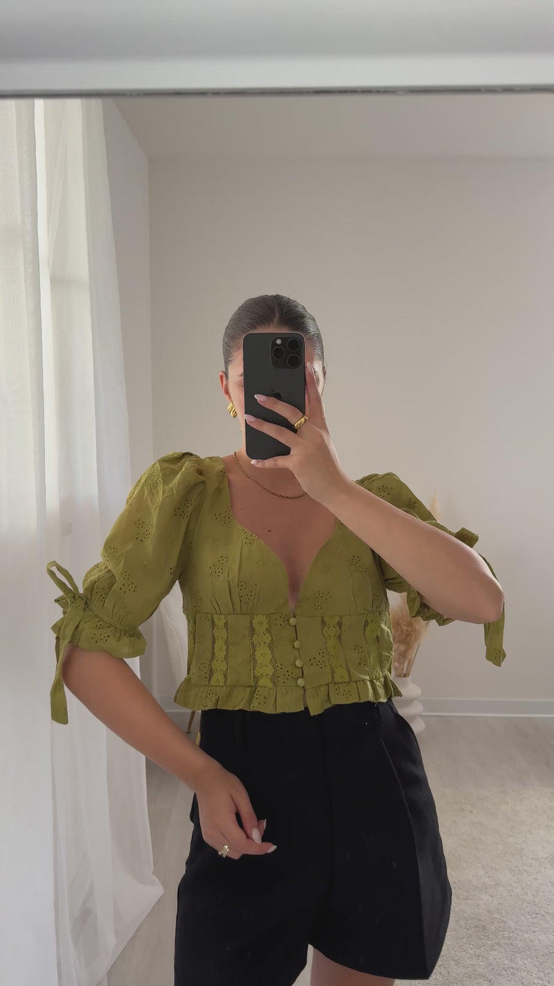 Flower top with neckline, buttons and transparencies. Back closure with bow and puff sleeve.