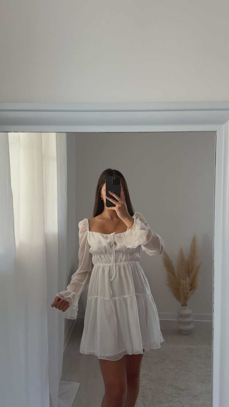 Abito in tessuto simil chiffon caratterizzato da volant ed elastici in vita.