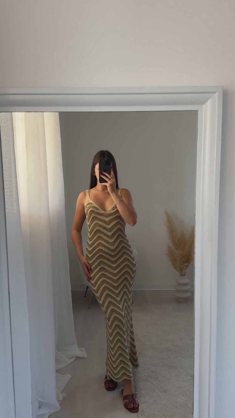 Abito uncinetto con tessuto lurex oro e beige, traforato e leggermente elasticizzato.