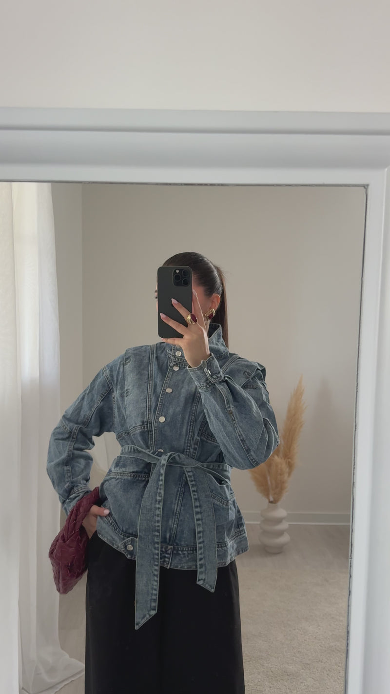 Giacca in denim con cintura in vita rimovibile e chiusura con zip e bottoni rapidi.