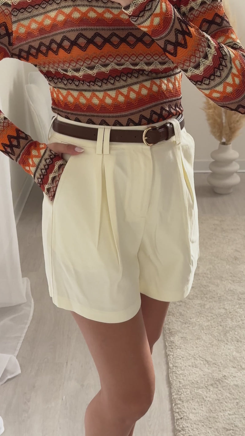 Pantaloncino panna top quality, tessuto ben strutturato. Tasche laterali, passanti per cintura e cintura marrone inclusa.